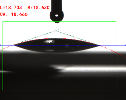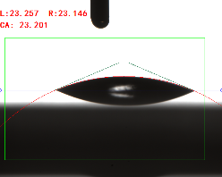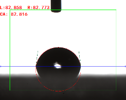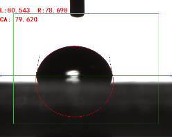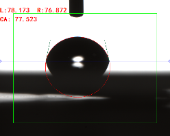 寬高法(量高法或Θ/2法)手動(dòng)畫出液滴的高度和接觸面寬度,通過反三角函數(shù)求出其接觸角(0.3ul或低角度時(shí)可使用)