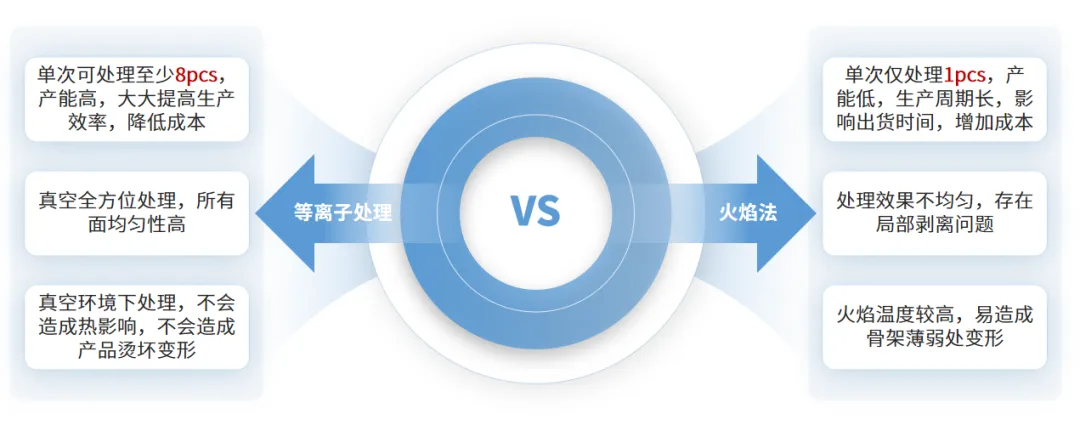 火焰法單次僅能處理1pcs,等離子處理單次可處理至少8pcs,可以極大地提高生產(chǎn)效率,提升產(chǎn)能,從而縮短生產(chǎn)周期,滿足高效生產(chǎn)的需求。